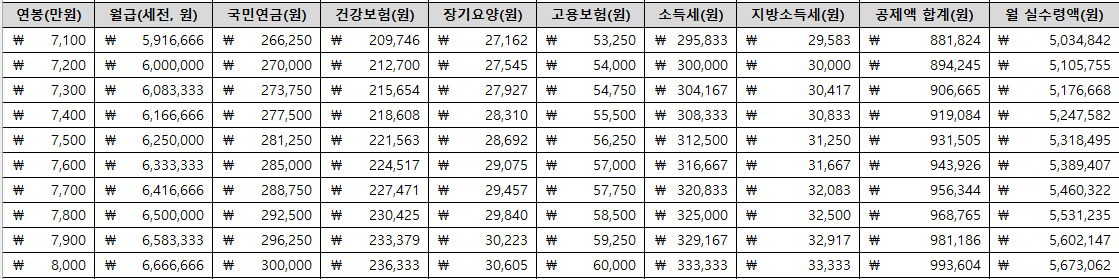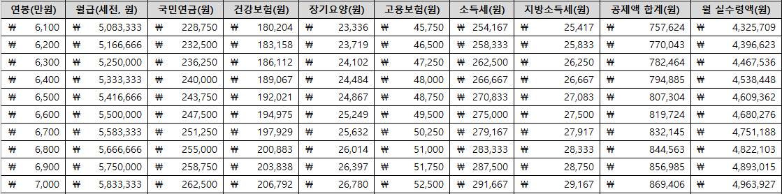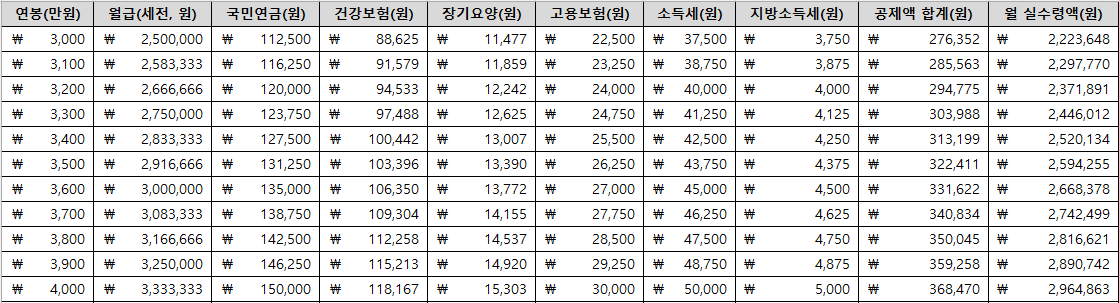 연봉(만원)월 급여(세전)세금 및 4대 보험 공제액월 실수령액연 실수령액