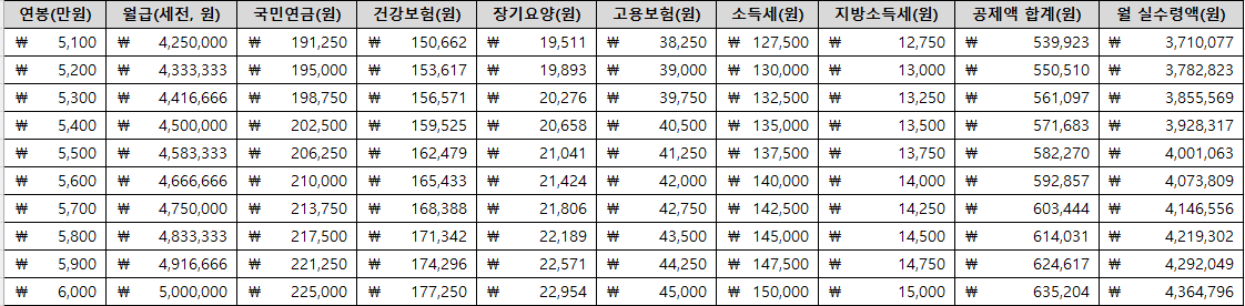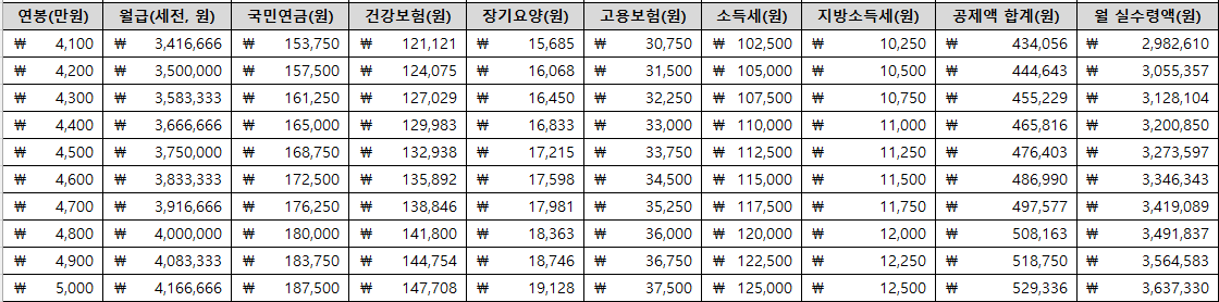 아래 표는 2025년 기준 연봉별 실수령액을 정리한 것입니다. 4대 보험료와 소득세를 포함하여 계산되었으며, 개인별 공제 항목에 따라 차이가 있을 수 있습니다.